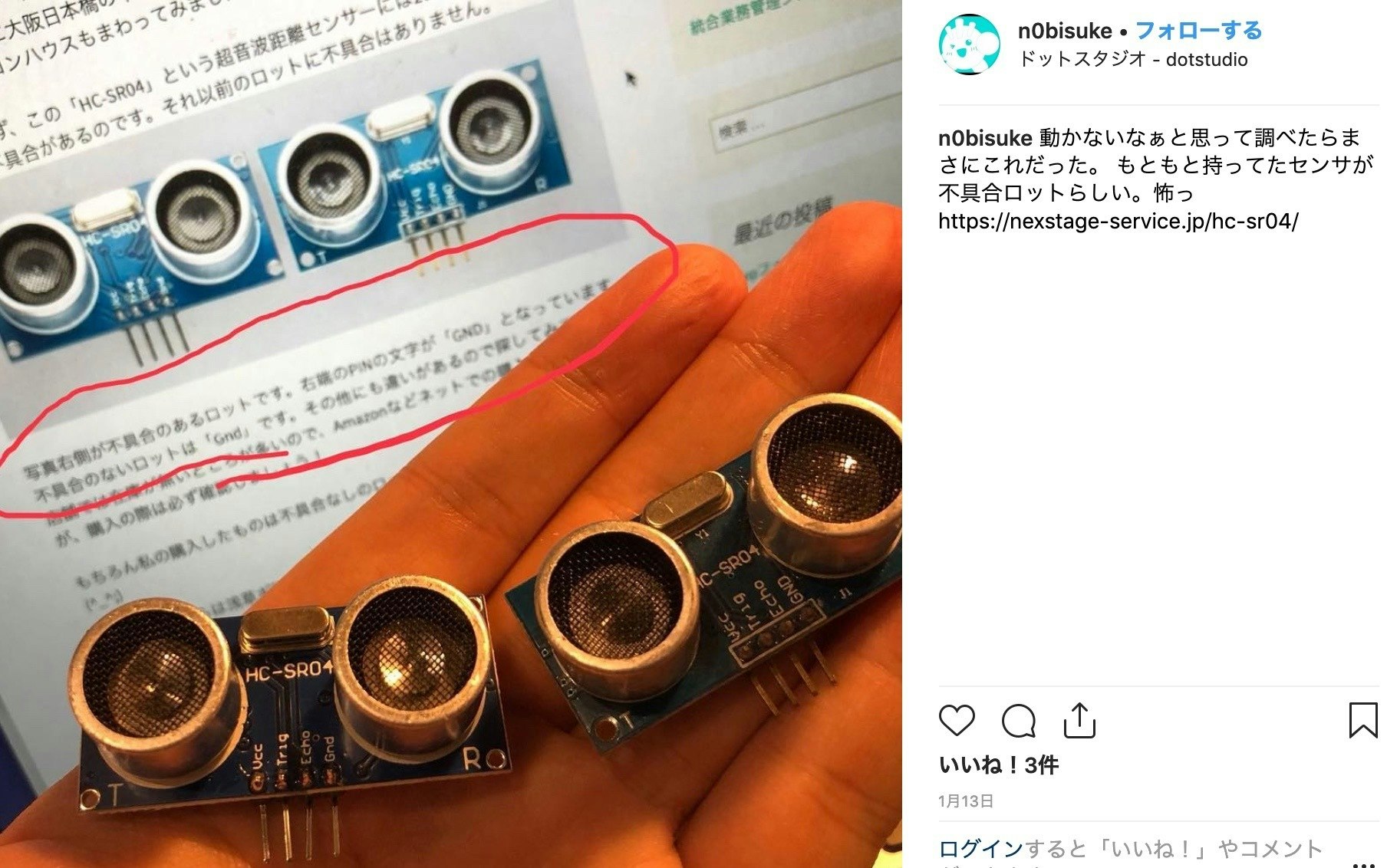 今回利用する超音波センサ、ロットによってはやばい奴があるらしいので気をつけましょう。