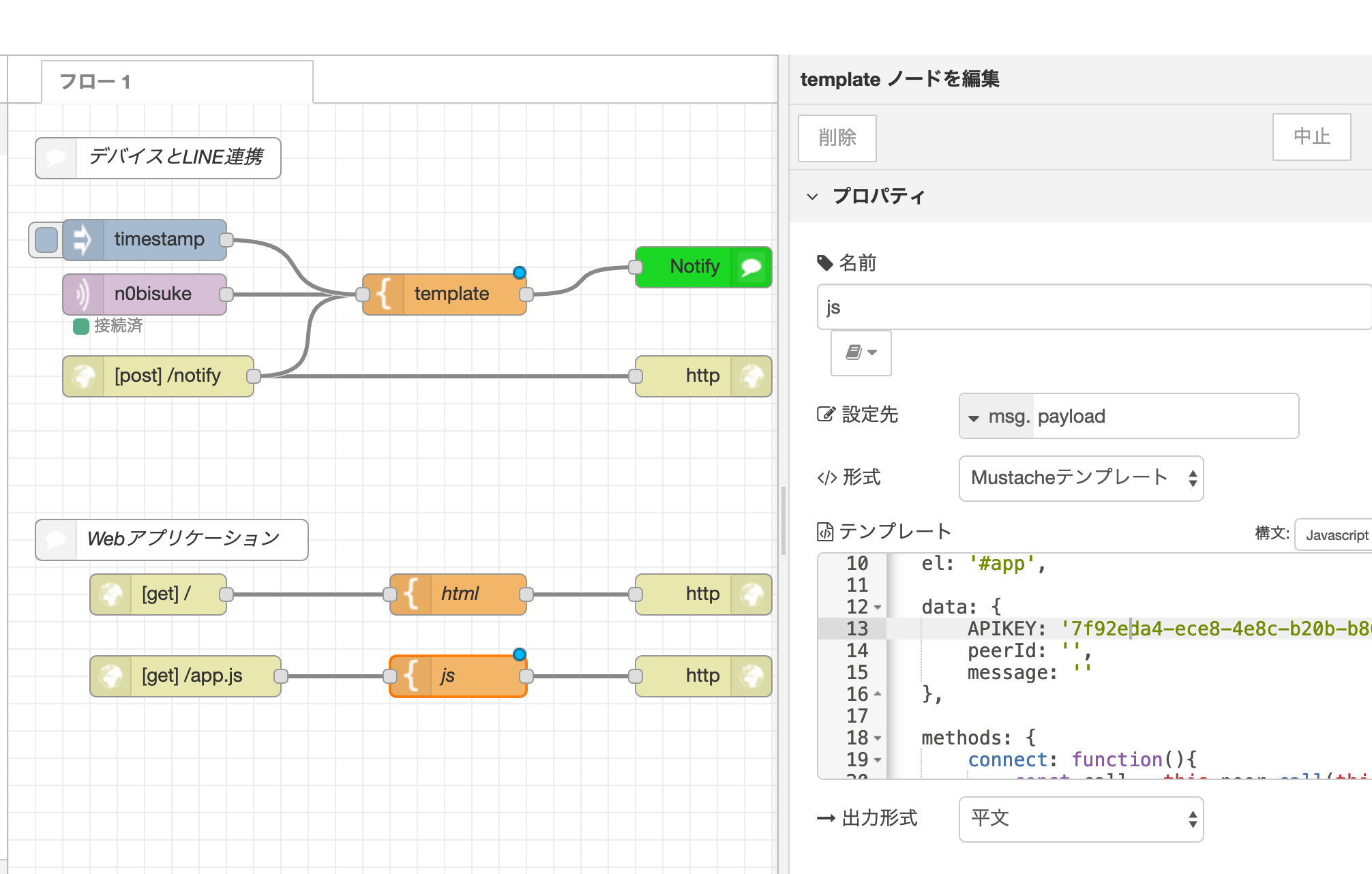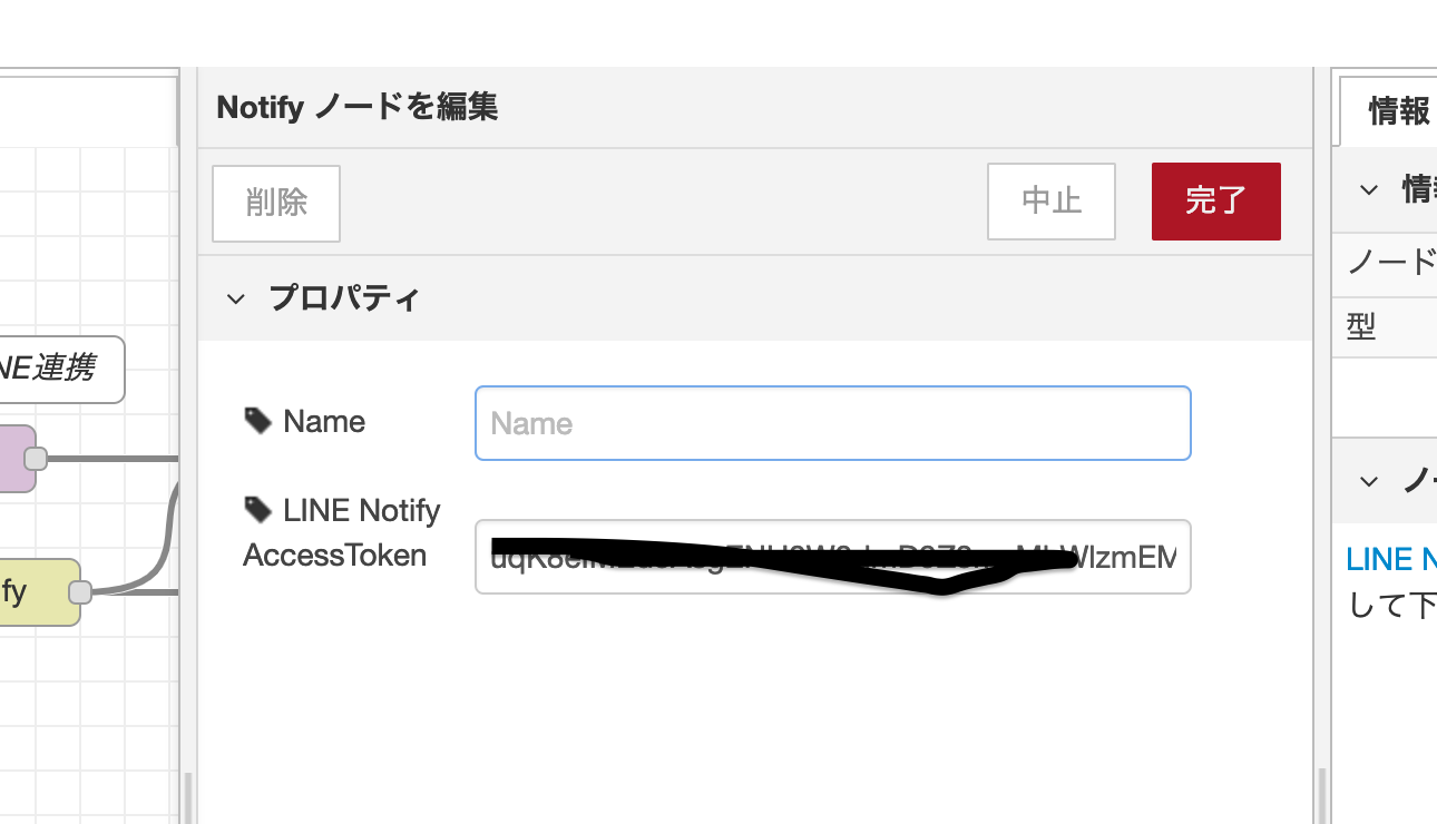 - 緑色のNotifyノードをダブルクリックして設定フォームを開き、LINE Notifyのトークンを貼り付けて