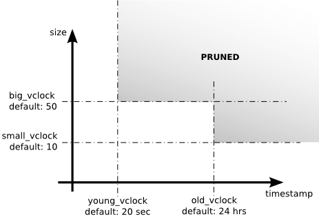 "young_vclock" と "old_vclock" パラメータは各 Vector Clock に格納されている timestamp に言及します。リストの長さが "small_vclock" と "big_vclock" の間にある場合に timestamp を確認します。timestamp が "young_vclock" より若い場合は、切り詰められません。timestamp が "old_vclock" より古い場合は、切り詰められます。