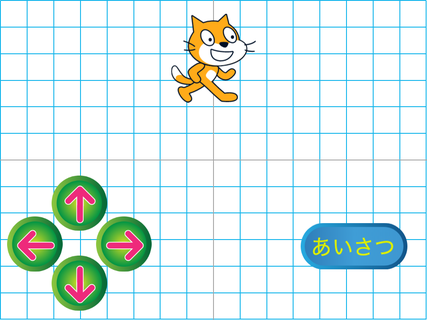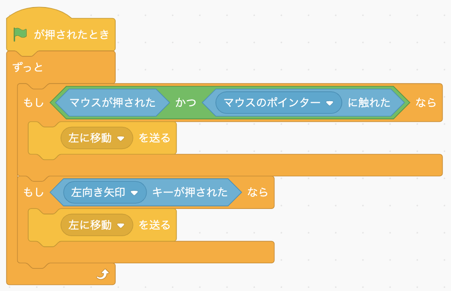 Scratchでアクションゲームを作るときには、十字キーとボタンをもつバーチャルパッドを用意することになると思います。スマフォなど画面を直接タッチして操作する方式と、PCなどキーボードで操作する方式のどちらも用意したい時があります。そのような時は、それぞれの条件を定義して、その結果起こるアクションをイベントで通知すると作りやすいと思います。