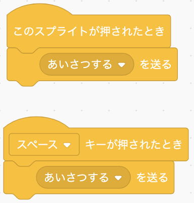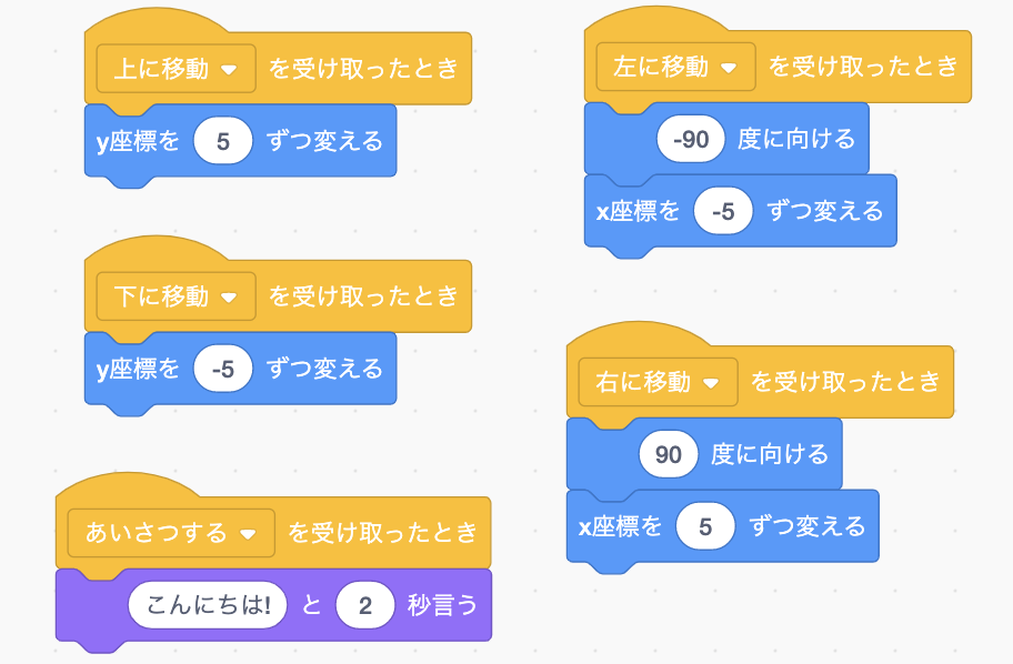 あとは、動かしたいキャラクターのスプライトのコードに、イベントに対する動作を作ります。