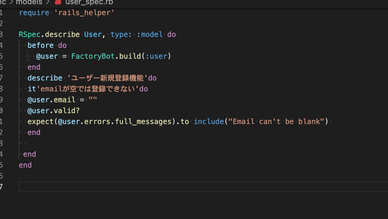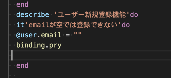 早速エラーメッセージの確認をしていきます。今回はemailが空の時は登録できないことを検証します。