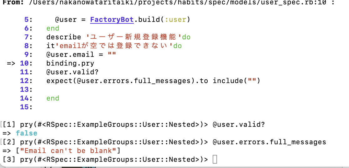 コンソール上に@user.vaild?と打ち込むとfalseとでます。