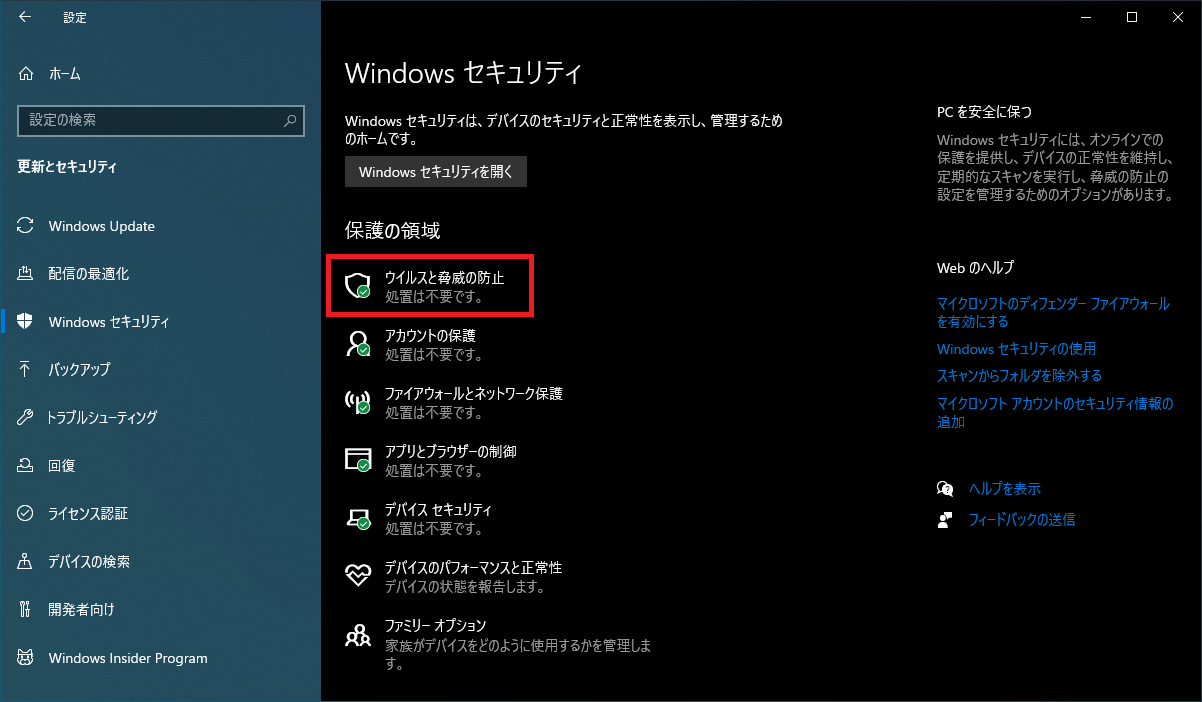 2: 「更新とセキュリティ」→「ウイルスと脅威の防止」