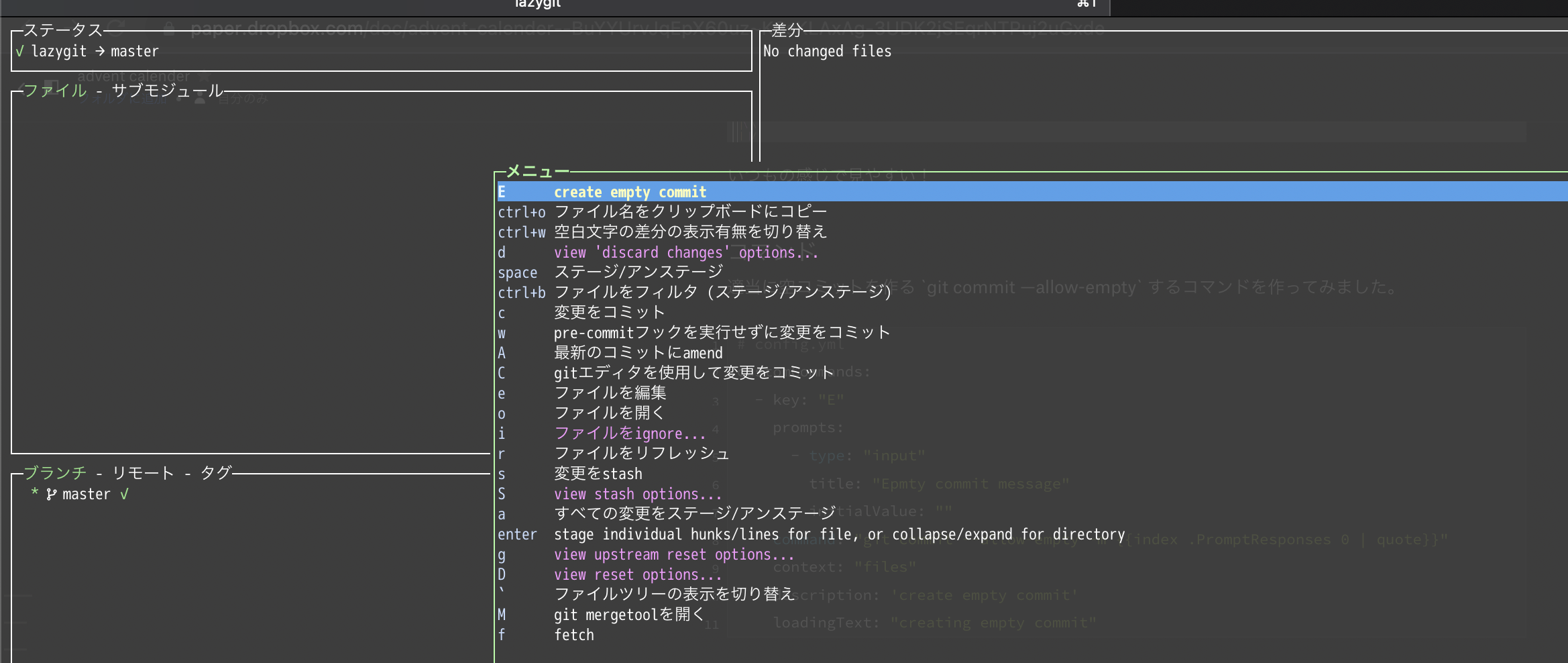E をタイプすると空コミットメッセージのプロンプトが出るので空コミットがかんたんに作れるようになりました。