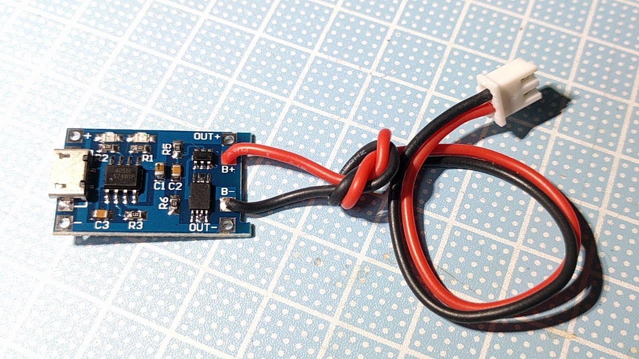 今作っていた80mAhのLiPoを使ったガジェットに接続。赤のLEDは充電中。