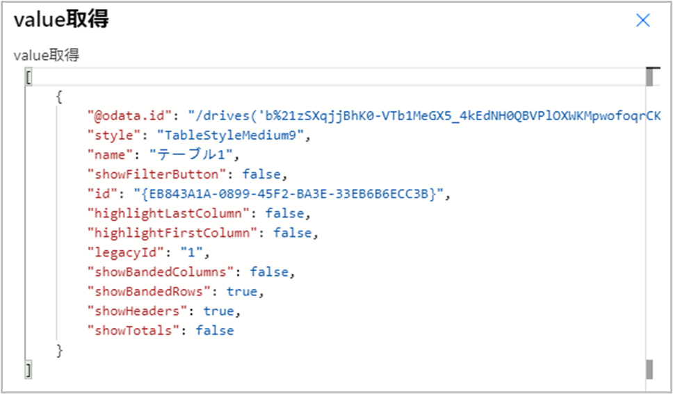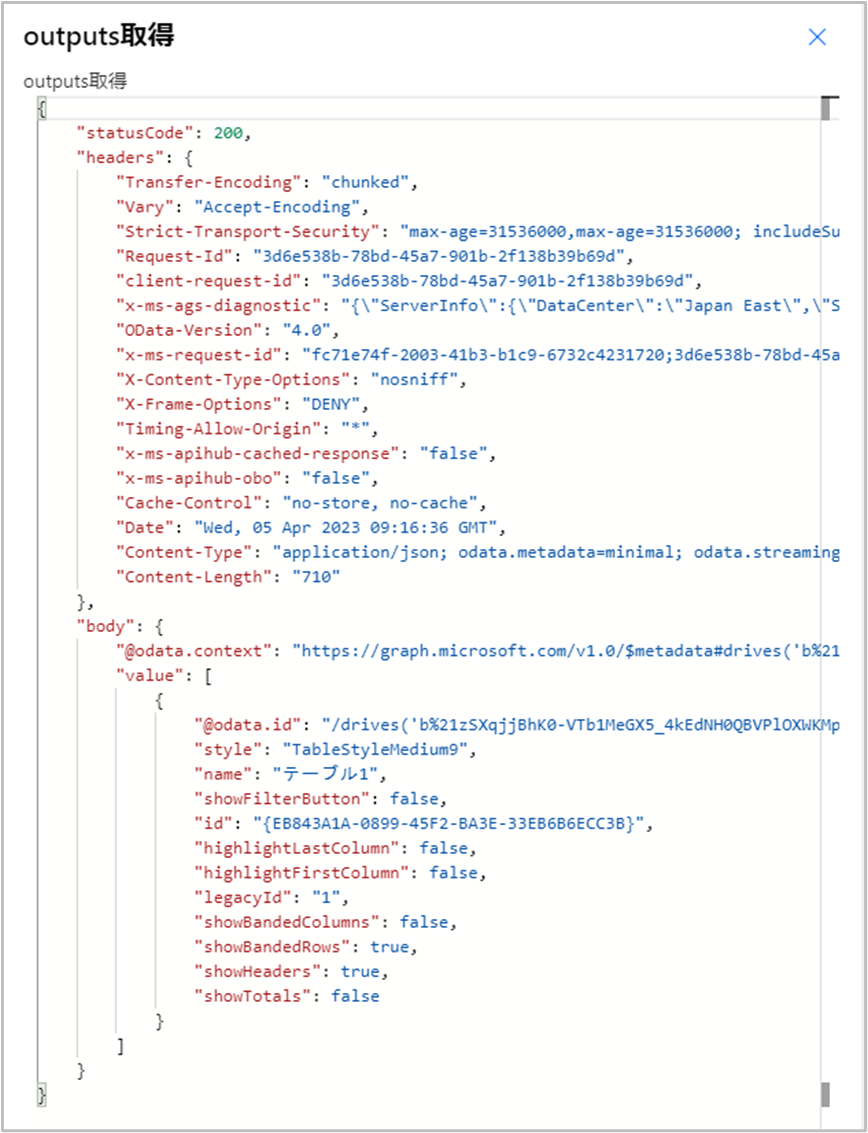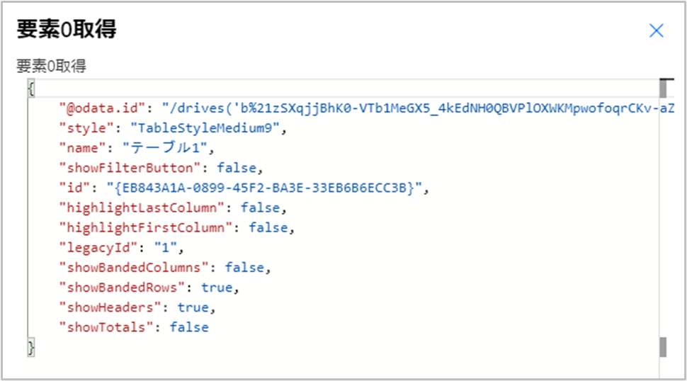 Excel の表データにはない @odata.etag 、ItemInternalId というものが付いてきていますね。