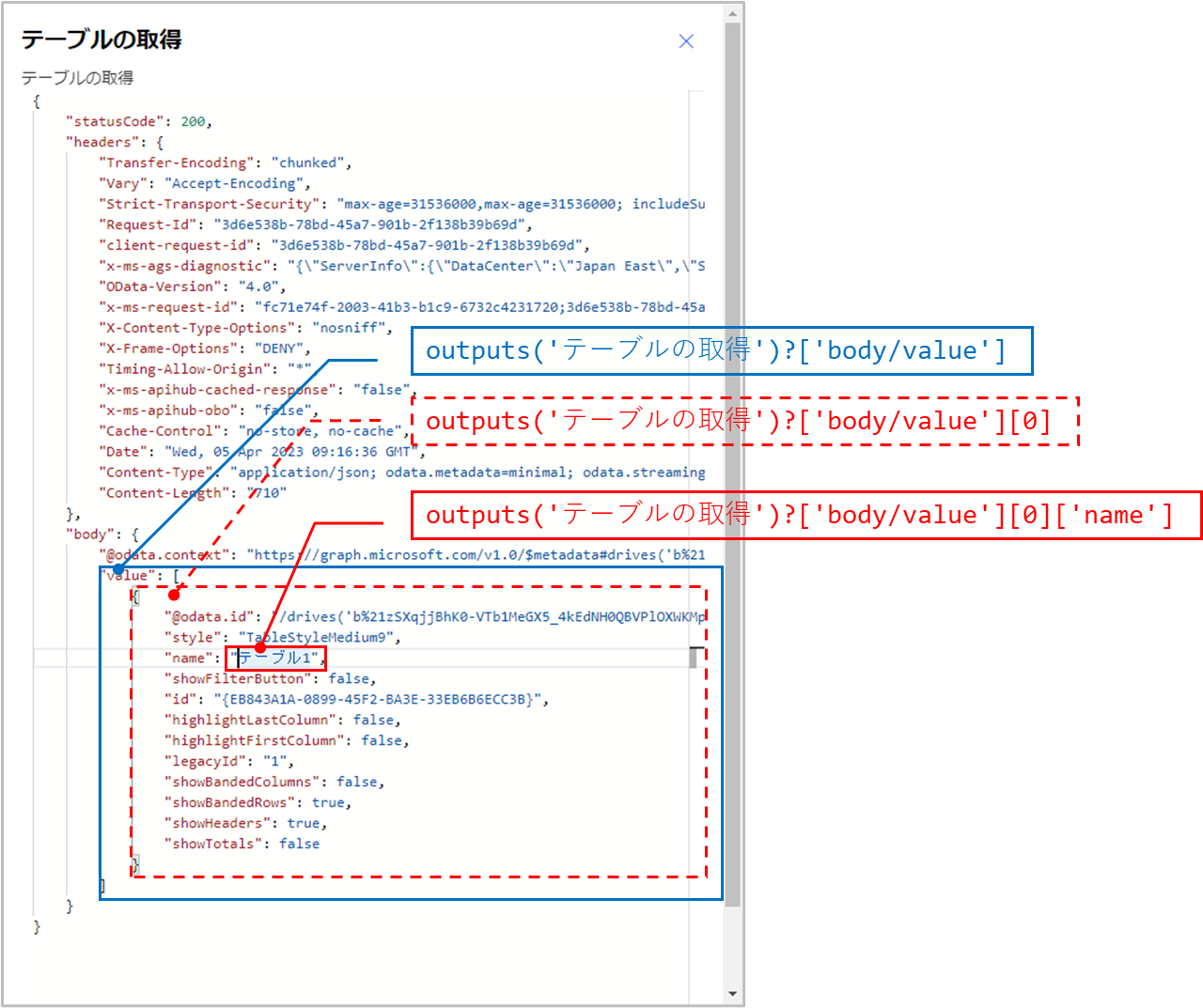 outputs('テーブルの取得')?['body/value'][0]['name']