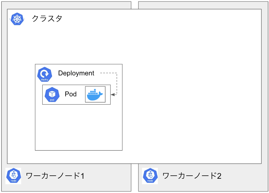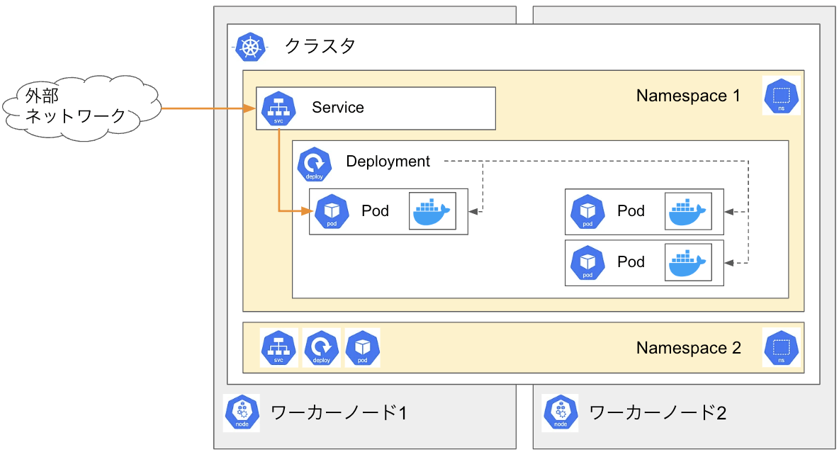 Kubernetesの最小実行単位であり、1つ以上のコンテナをまとめて実行するためのひとつの空間。Pod内には複数のコンテナを配置することができる。