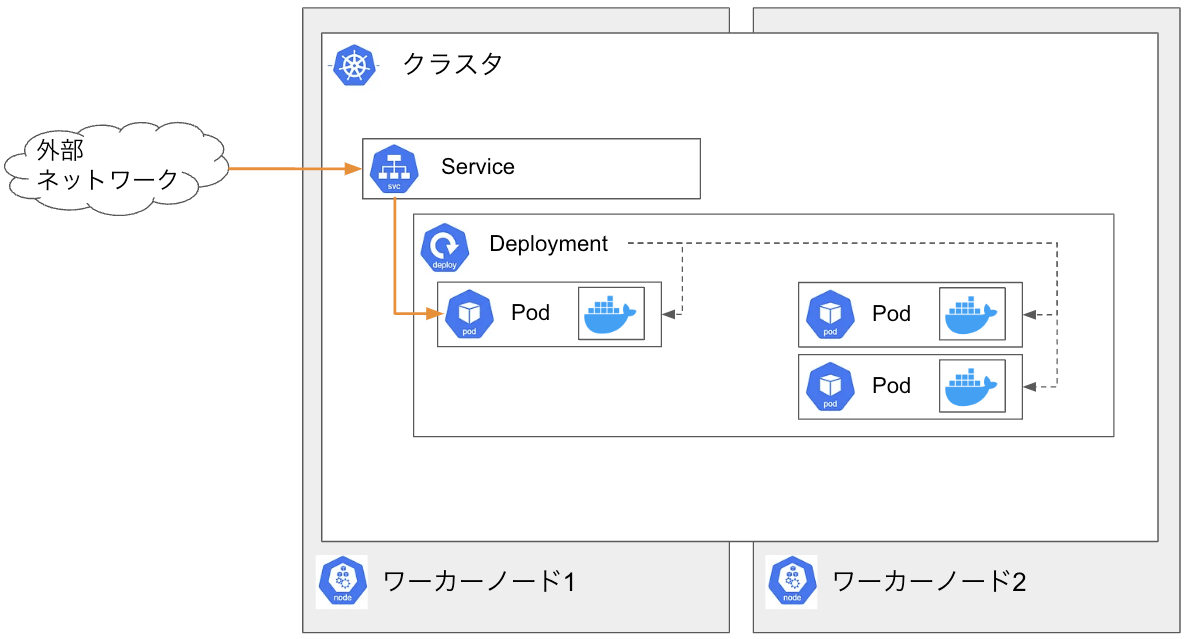 クラスタの内部および外部からPodとの通信を容易に行うためにエンドポイントの提供を行ってくれる機能。クラスター内のPod (コンテナ) に対して一意なネットワークアクセスを提供する抽象化されたリソース。