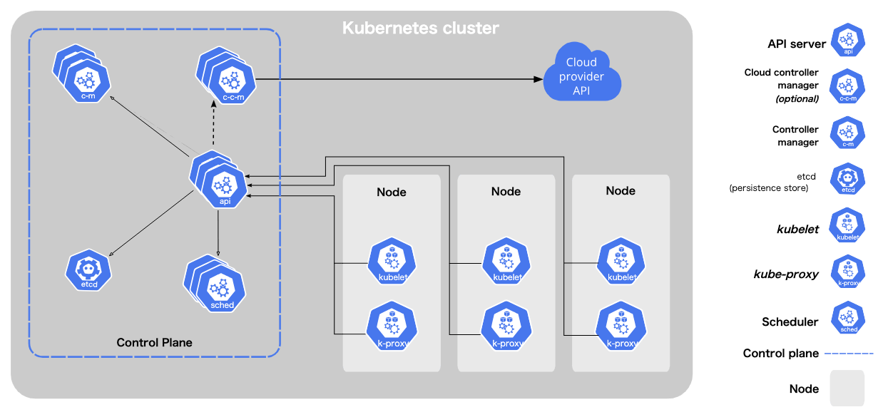 Kubernetesクラスタのマスターコンポーネント(kube-apiserver, kube-controller-manager, kube-scheduler, etcdなどを実行) で、クラスタの状態を管理・制御を行う。マスターノード上で実行される。