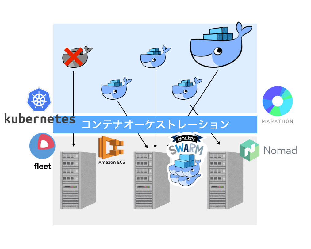 複数のコンテナ管理を自動化して、アプリケーションのデプロイ、変更の適用、スケールアップやスケールダウンを行ってくれる。コンテナがダウンしてしまったり、間違えて削除してしまったりした場合も自動で回復させることが可能。