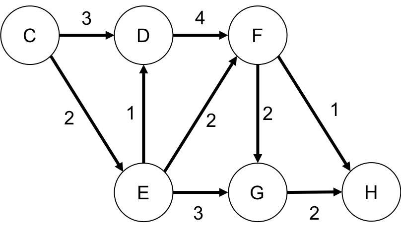 さて, そのYenのalgorithmを英語版Wikiのグラフを用いて簡単に説明したいと思います. **始点はC**で**終点はH**とします. 厳密なアルゴリズムではなく, 直感的に理解できようにその流れを説明します. おそらくアルゴリズム自体はそんなに難しくないはずです.