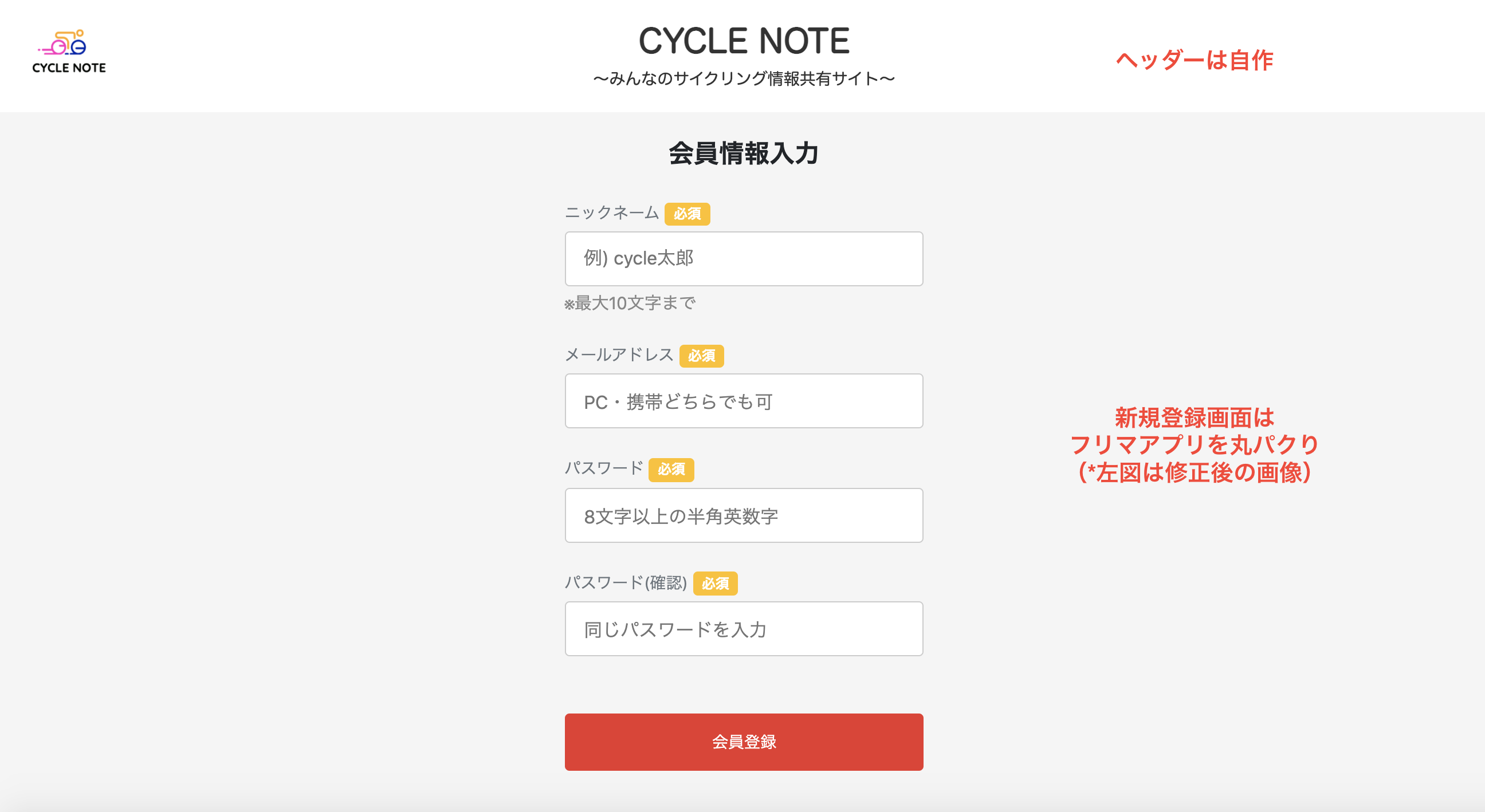 まず、作りたいもの・作れるものの両方を意識して、アプリの構想を固めたはいいものの、どこから手をつけてよいかという点は結構悩みました。というのも、スクールの課題ではフロント側をほとんど一切いじってなかったからです。そこで、色々考えた結果、新規登録・ログイン画面はサイトによってそんなに変わらないので、一旦フリマアプリのものを全部パクろうと考えました。もちろん、最終的には修正するつもりでしたが、何もないところで1から始めるよりも、一旦ビューを丸パクりして少しずつ修正していく中で、フロント側の言語に慣れようと考えました。その中でも、ヘッダーとフッターだけはフリマアプリをまるパクりという訳にはいかないので、ヘッダーとフッターを作りつつフロントの言語にも慣れていきました。今は、新規登録画面も修正済ですが、イメージ的には、下図の感じです。