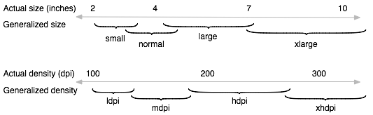 以下の図はSupporting Multiple ScreensページにあるScreen Sizesとインチ数(と画面密度)のマッピング図です。