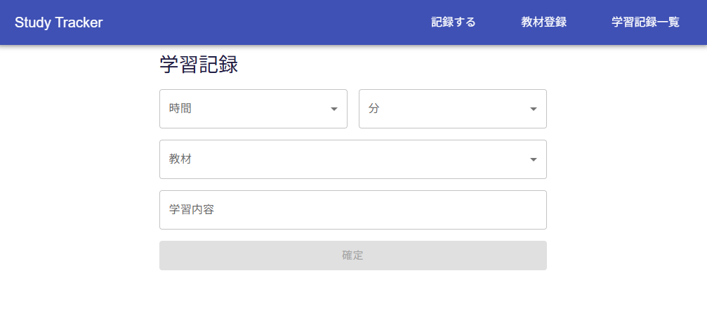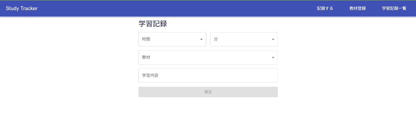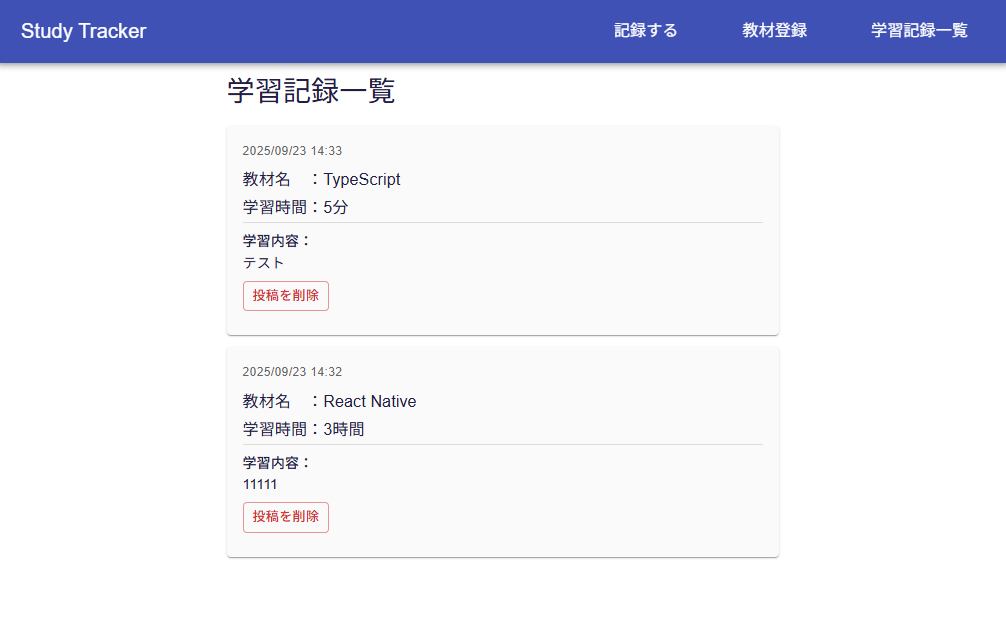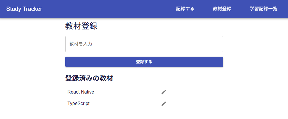 - 画面数:3画面(学習記録、教材登録、学習記録一覧)
