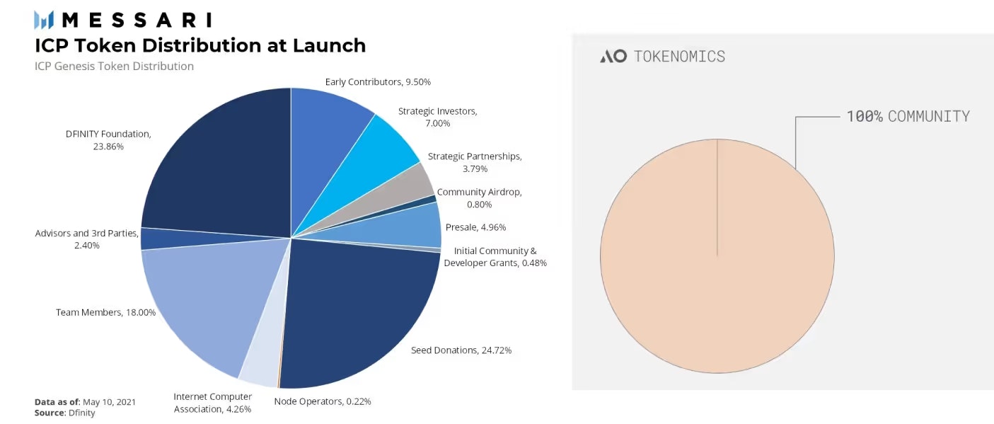 AO のフェアローンチは、すべてをコミュニティに提供するというミッションを反映しています。総供給量の36%は時間をかけて AR 保有者に分配され(長期保有のインセンティブ化)、残りの64%は経済成長の推進に対する報酬として分配されます(他のネットワークからの資産のブリッジングなど)。上記のチャートで示されているように、AO のフェアローンチは ICP とは異なり、プライベートセール、チームメンバー、初期投資家へのトークン配分を含みません。すべてがコミュニティに向けられています。