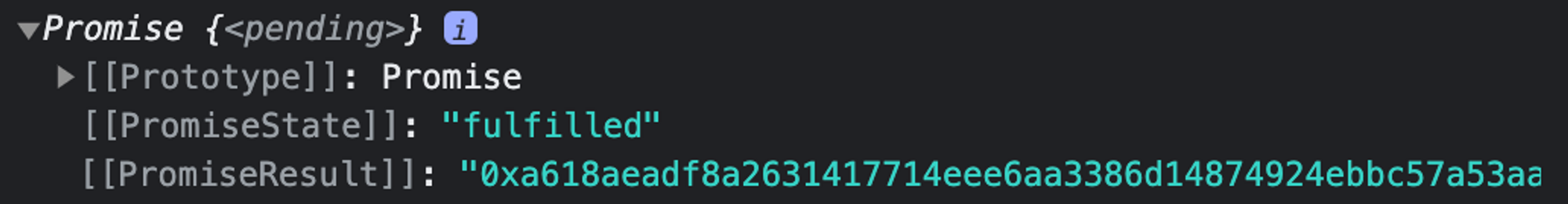 メタマスクで署名(Sign)を実行後、Promiseで署名(Signature)が返る。