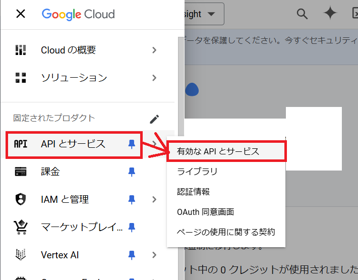 5.サイドメニューから「APIとサービス」と「有効なAPIとサービス」をクリックしてください