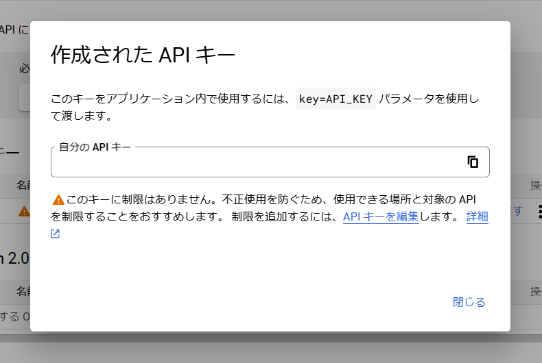 12.このようにAPIキーが発行されました。なおキーは絶対に外部公開しないでください。