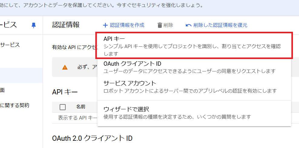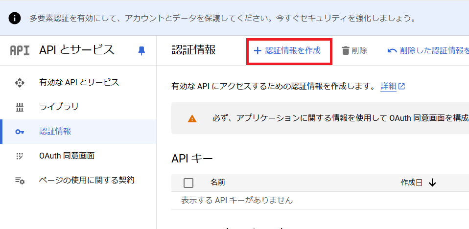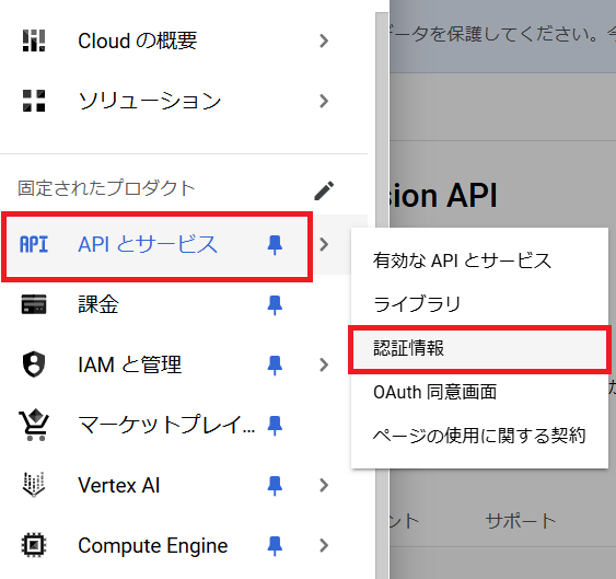 9.サイドメニューから「APIとサービス」と「認証情報」をクリックしてください