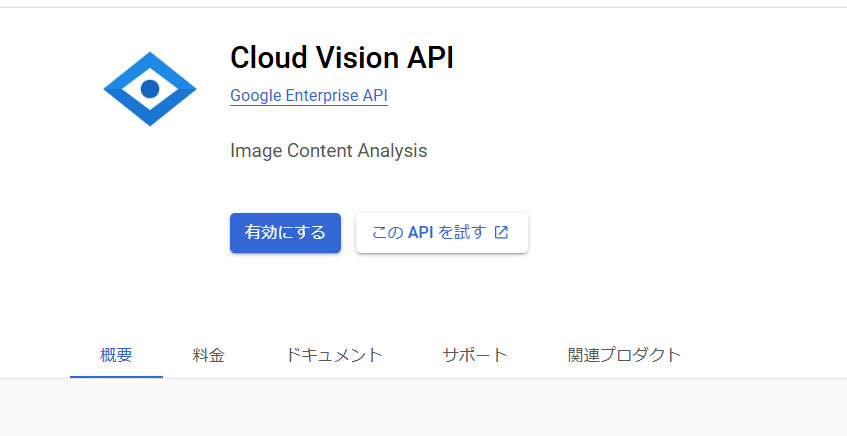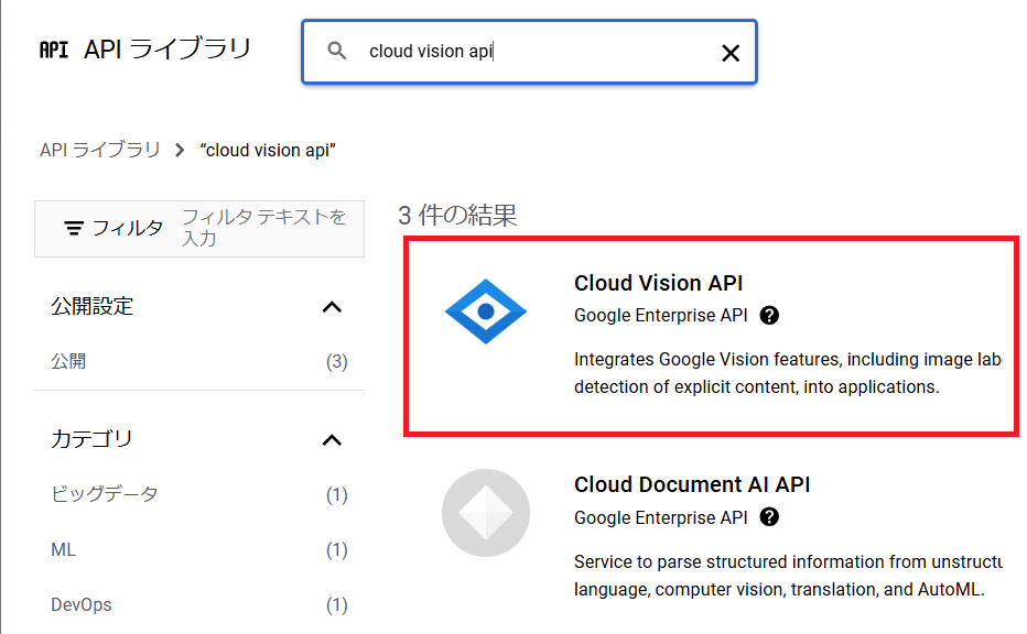 7.検索フィールドに「cloud vision api」と入力して、Cloud Vision APIをクリックしてください