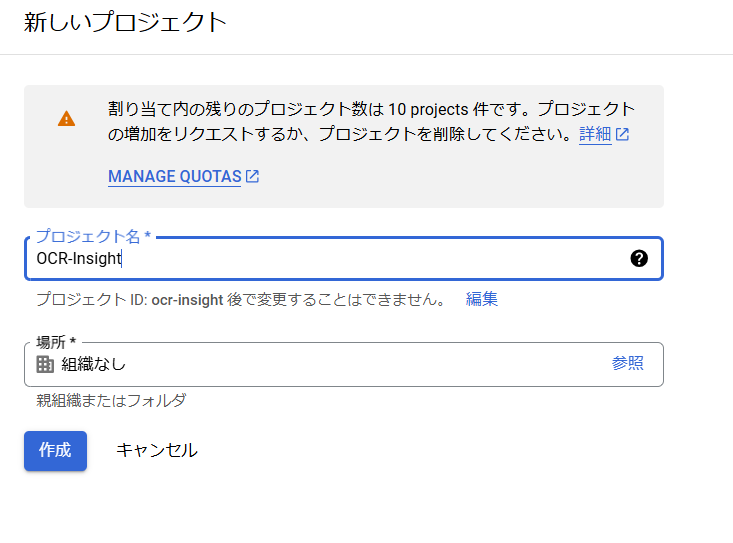 3.プロジェクト名を付けて、「作成」ボタンをクリックしてください