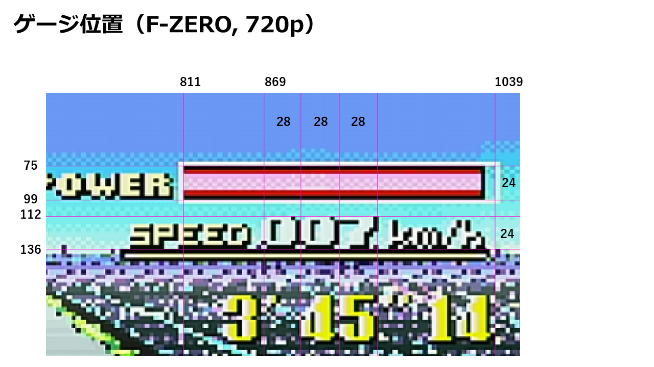 最初は「赤色部分の長さ」で判別しようとしましたが,Powerゲージが25%を切ると点滅し赤⇔グレーを繰り返すのでうまくいきませんでした.そののち,ゲージ部分を観察し右側に黒線があることに気づいたので,X方向で輝度最低のPixel位置を求めるような判定ルーチンを組みました.