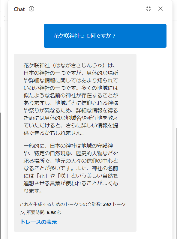 この状態で保存し、もう一度同じ質問を投げます。設定を変えたので、新しいセッションを作成(テキストボックスの左の💬+ボタン)して実行します。
