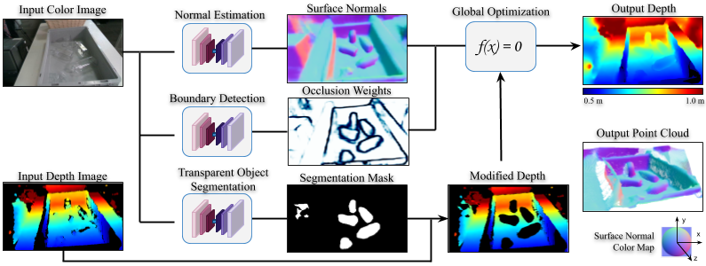 ClearGraspは、生の深度マップから透明な領域を直接除去し、その後、深度を復元するために最適化技術を使用します。この方法は、元の深度観測を完全に利用できず、透明オブジェクトの正確なセグメンテーションに依存していることに注意する。