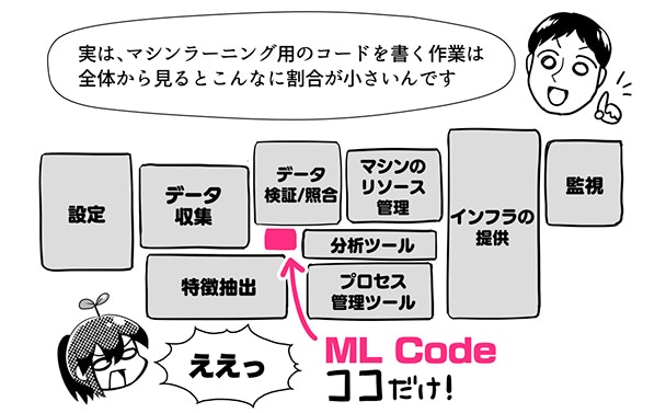 「図1:この図の中央の小さな黒い箱部分に示すように、現実世界の機械学習のうちほんのわずかな部分だけが、機械学習のコードでなっている。必要とされる周辺の土台は広くかつ複雑である。」