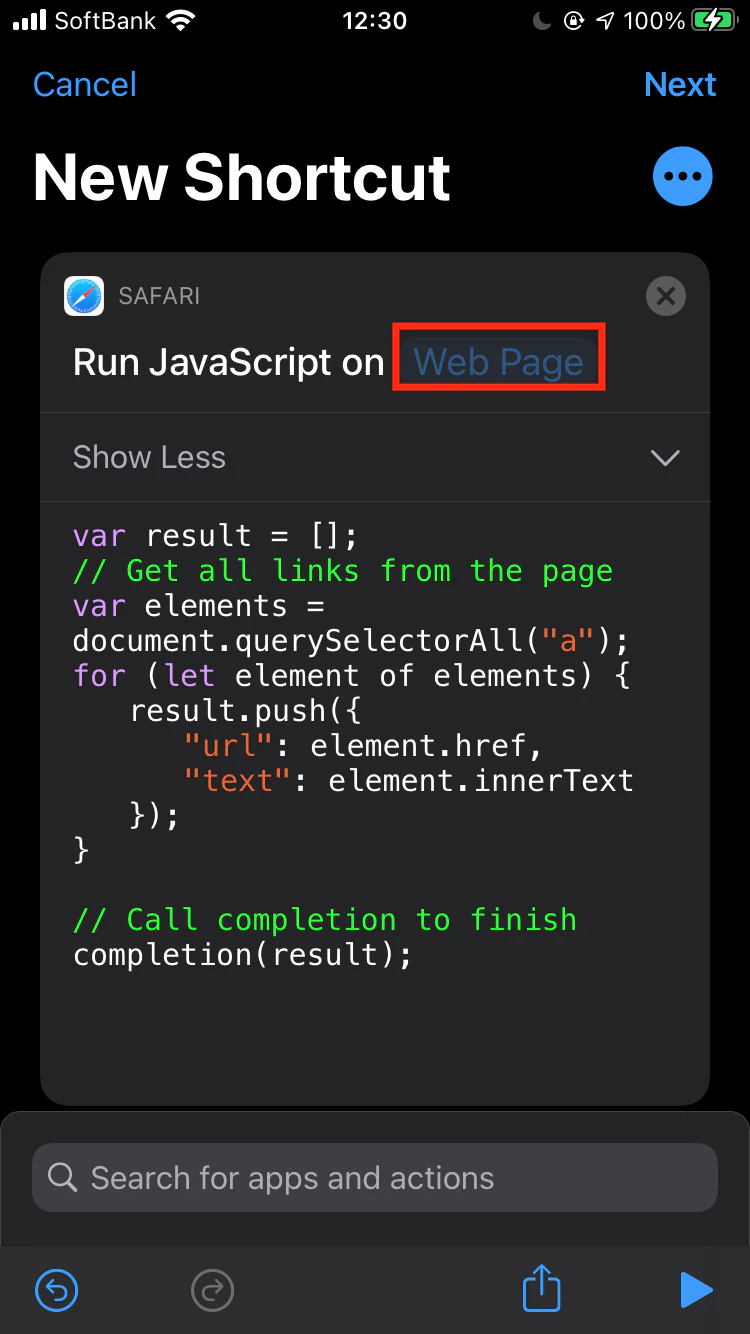 - ShortcutsアプリからでもBookmarkletの様に、閲覧中のWebページに対してJavaScriptの実行が可能