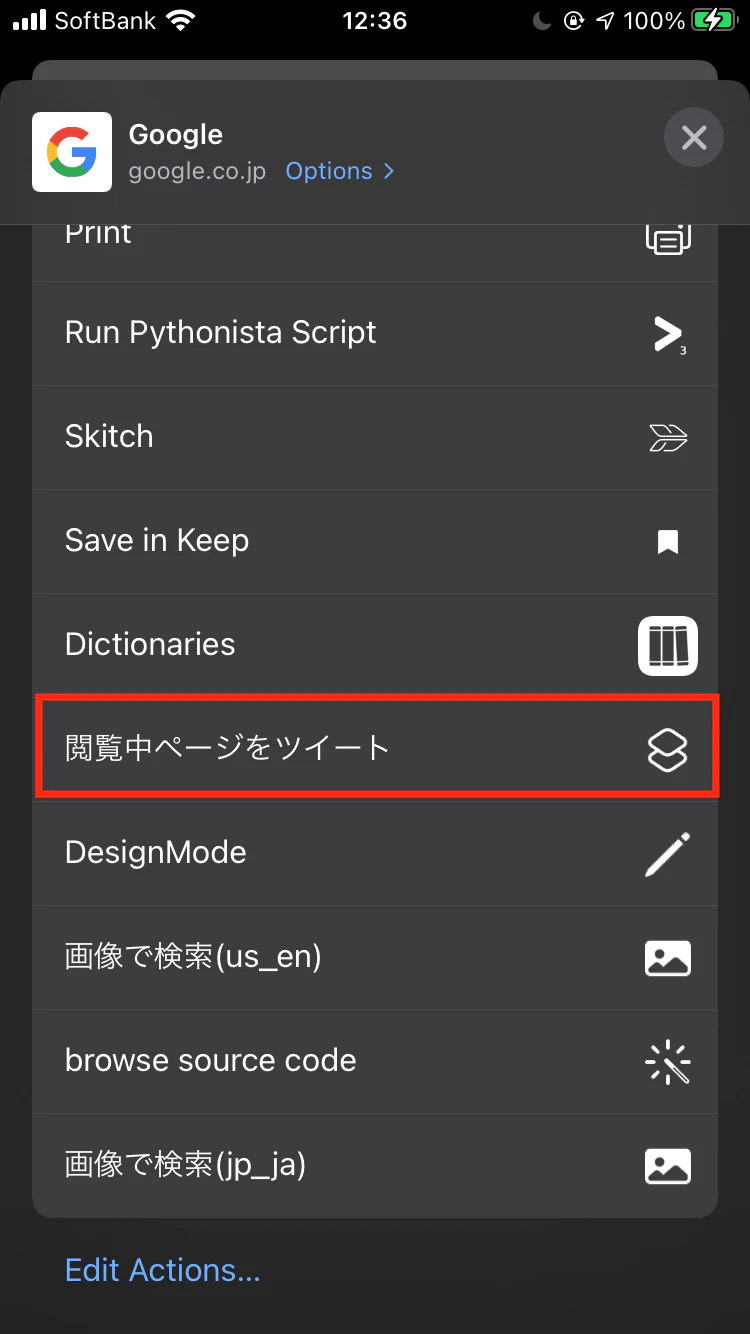 - 閲覧中ページのタイトルとURLが入力された状態のツイート画面に遷移する