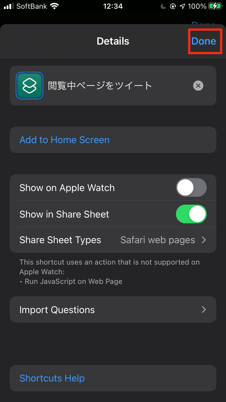 - 作成したShortcutのタイトルを設定して「Done」をタップ