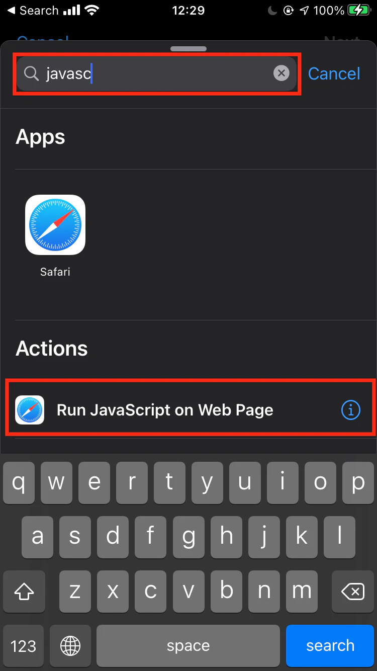 5. [+ Add Action]をタップし、「Run JavaScript on Web Page」を選択