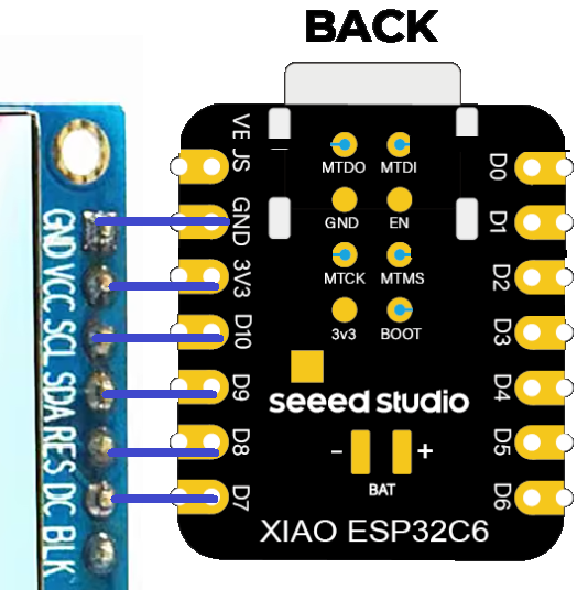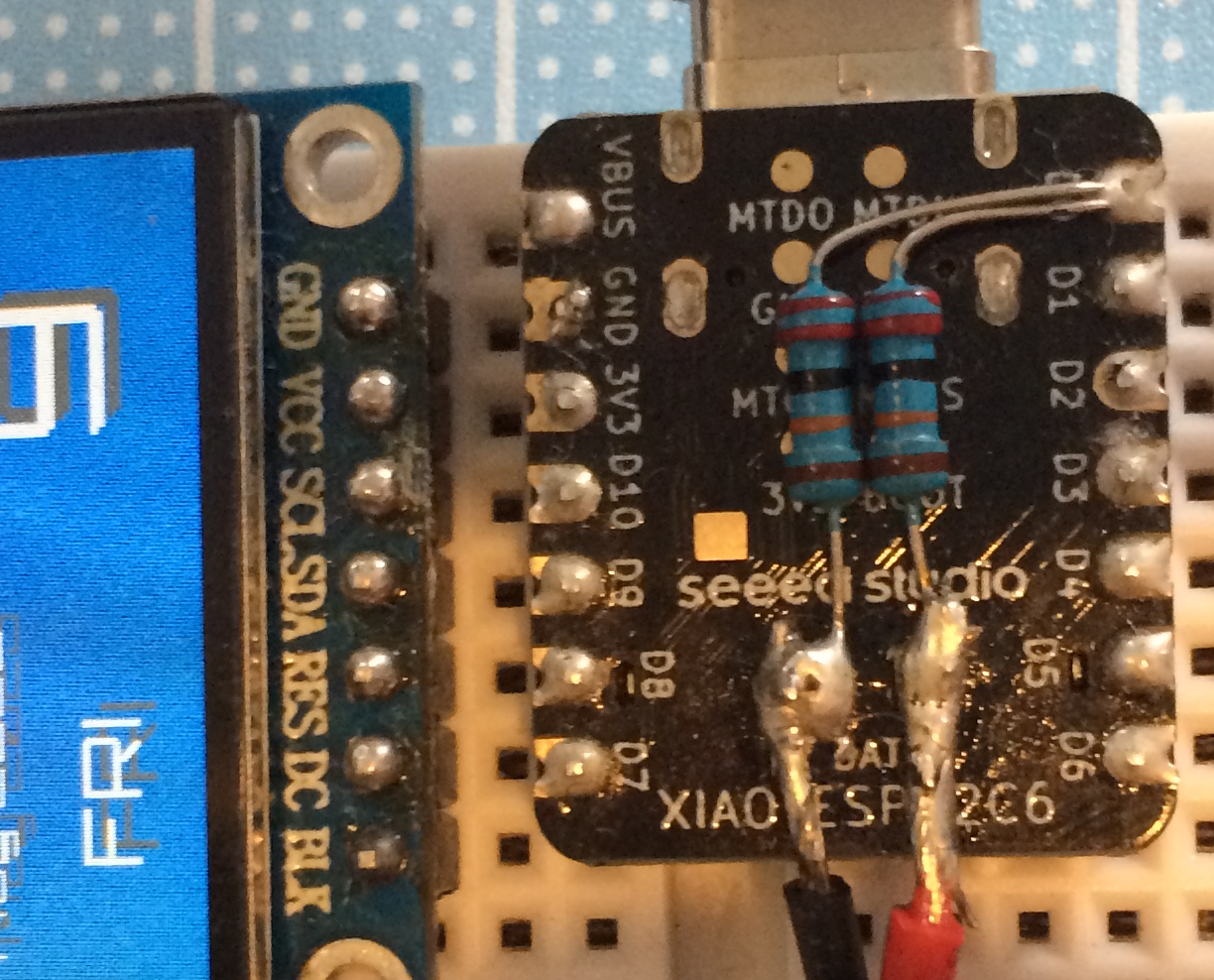 ST7789の方だけ、アクリル板にネジ止め。配線はブレッドボードからジャンパーピンに変えただけ。半田は使っておらず、ESP32C6は固定せずジャンパーピンでST7789にくっついているだけ。ジャンパーピンは取れやすいのでポリミドで一応固定。写真は分かりやすいように透明のままにしておいたけど、なにかでマスクて液晶以外を隠した方がおしゃれだと思う。そのうちやる。