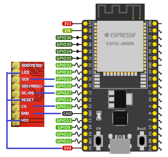 ※VCC、RESET、LCD は 5V に繋げる。写真では見えないが、TFTの下を通っている。RESETはGPIO14に繋げた方がいいかも。