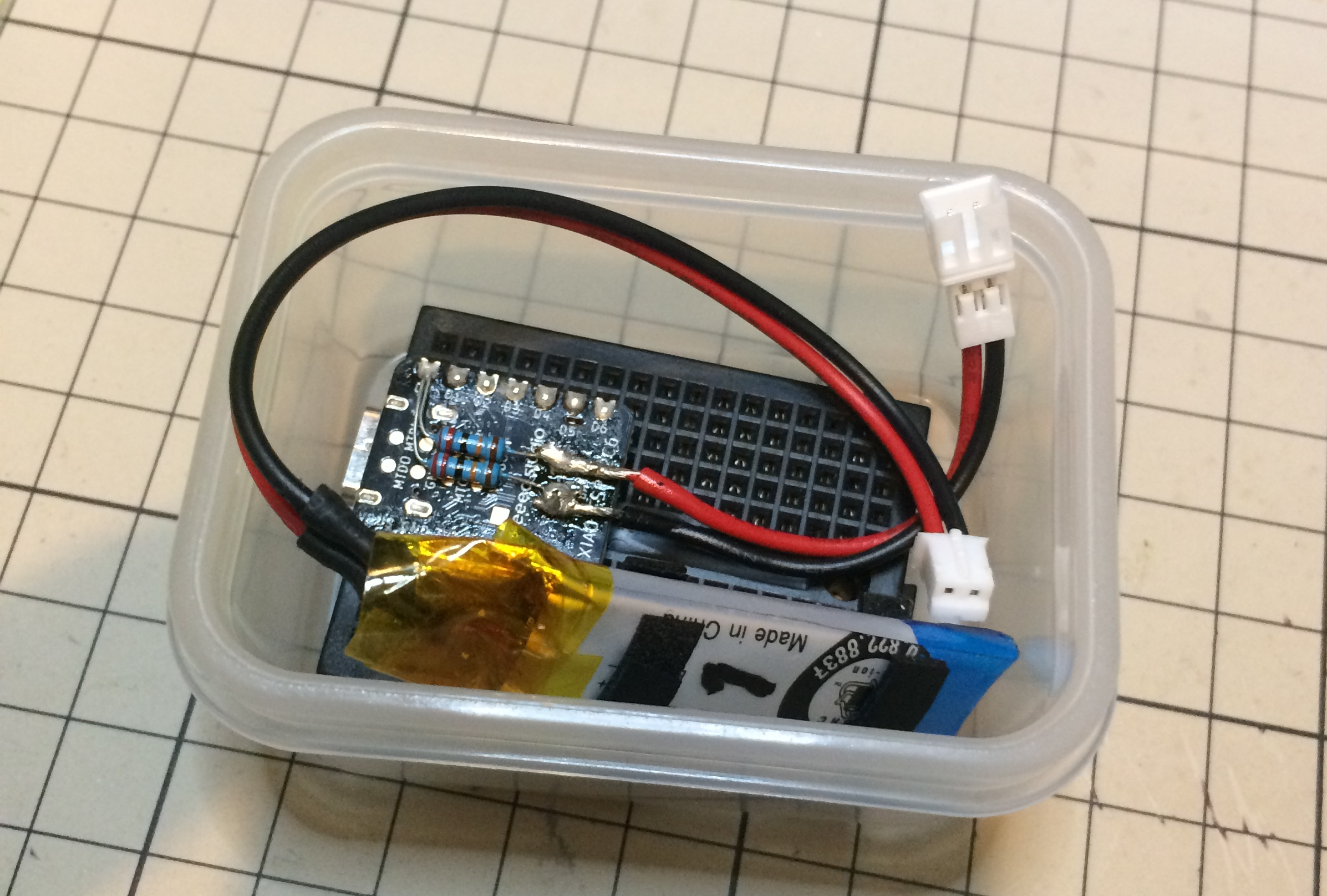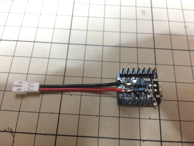 公式HPには、バッテリー電圧の読み取りの方法があります。抵抗220kで分圧してA0ピンで読み取るような仕組みです。私が実装したものを以下の写真です。バッテリー用にPHコネクタを付けました。