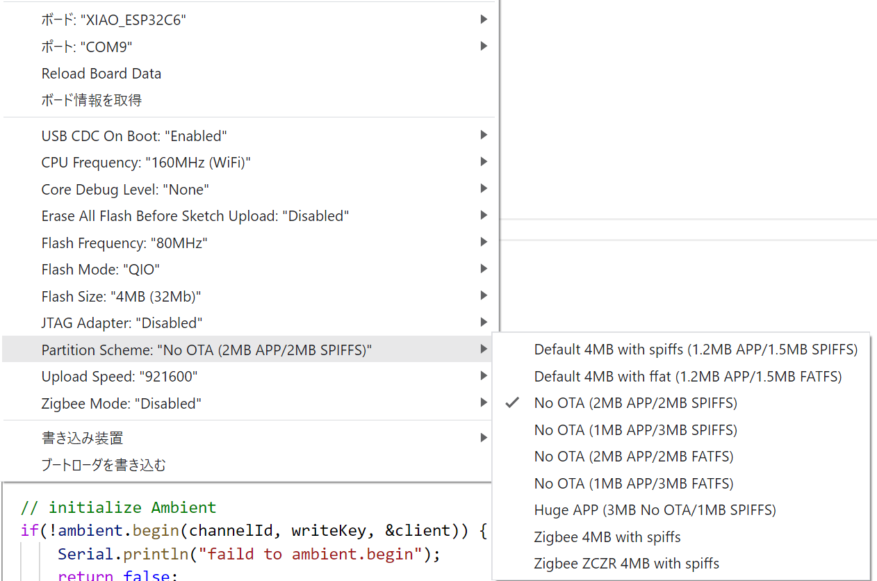 あと、WiFiとBLEを使うので、デフォルトのプログラム領域サイズだと書き込みません。OTAを使わないので、NoOTAに設定を変えました。