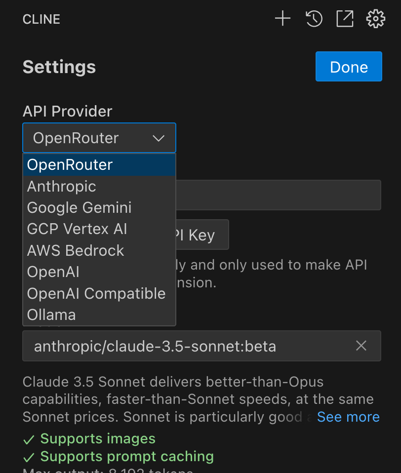 - 自分の使いたい API Provider の API キーを取得し、Cline にセット