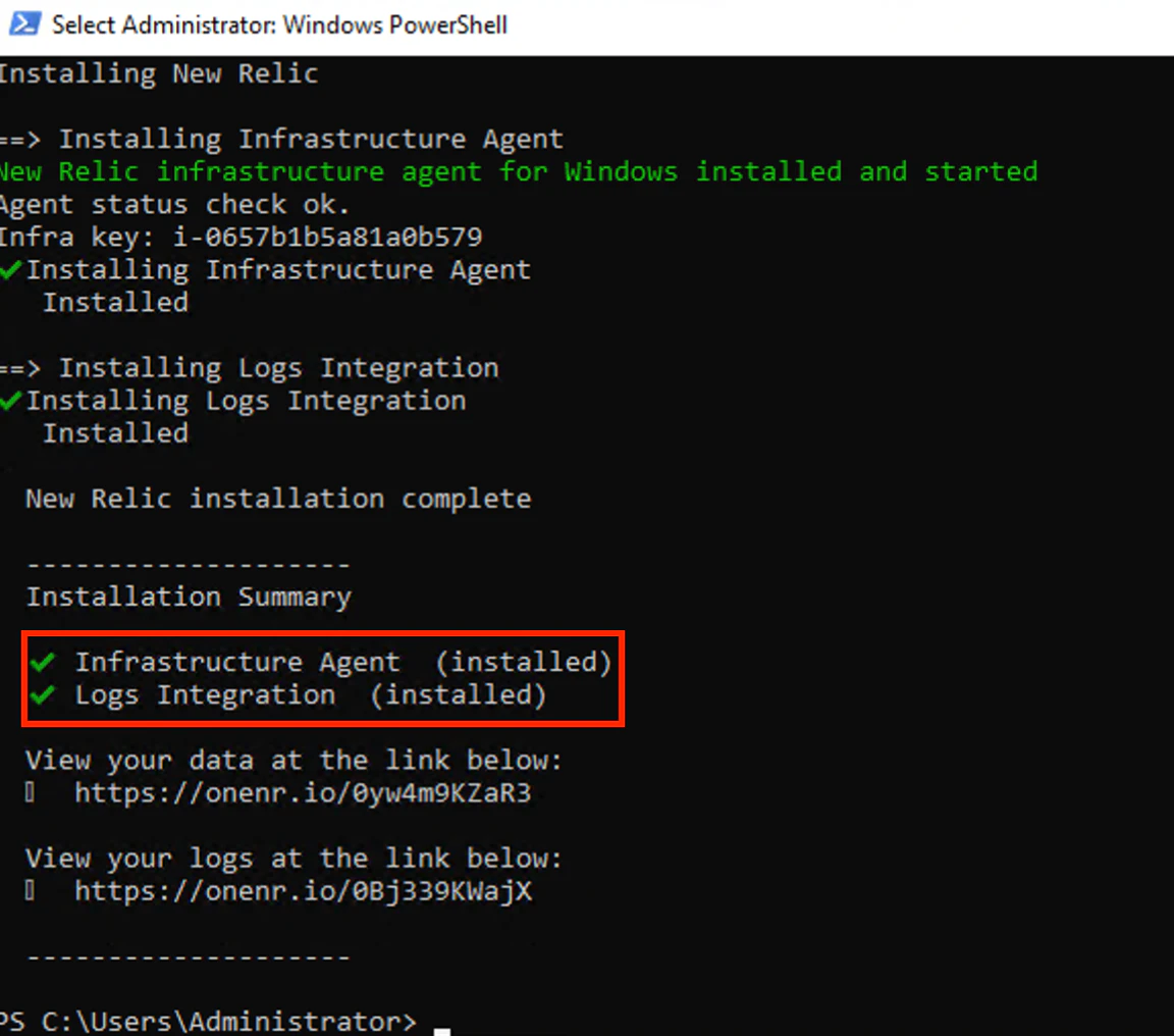 インストールが自動で始まり、Infrastructure エージェントとエージェントに内包されているログ転送用プラグインがinstalledになったことを確認します。これだけでインストールが完了です!