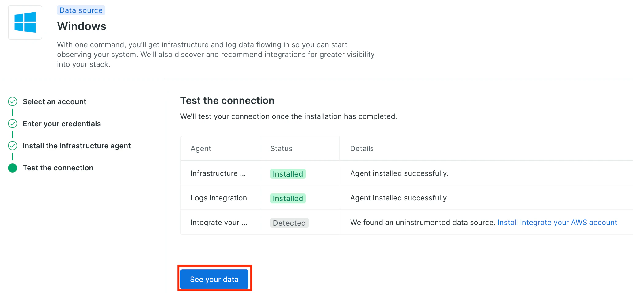 New Relicの画面に戻り、「Continue」→「See your data」をクリックして、データが送られてきていることを確認します。