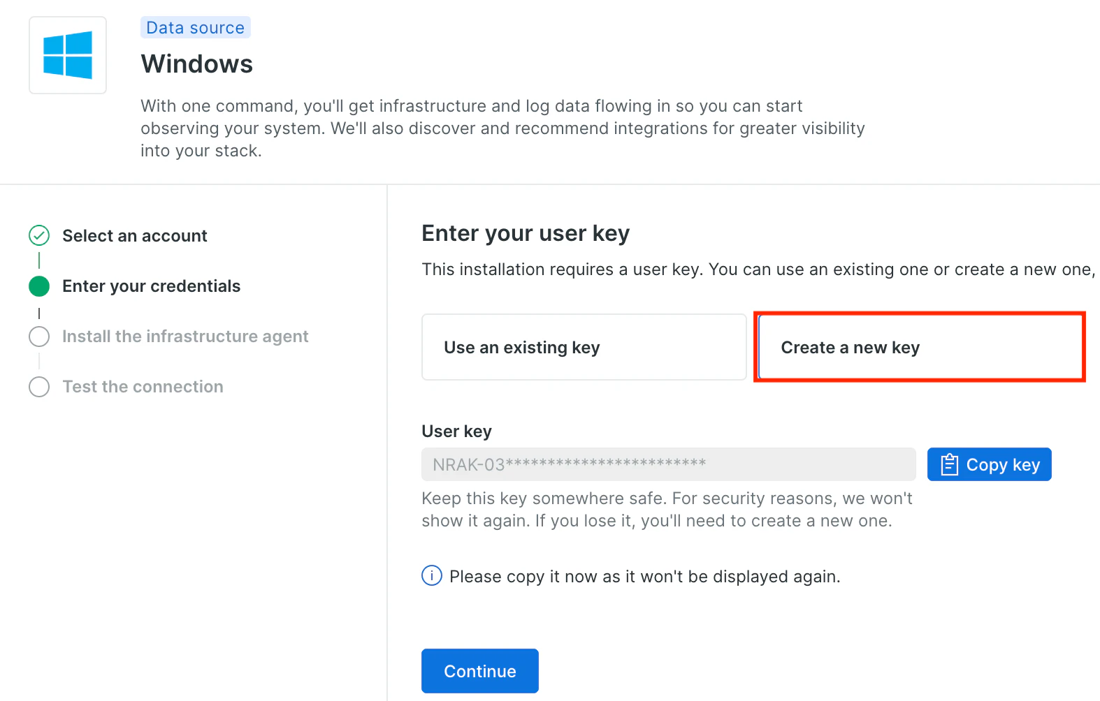 インストールで使用するuser keyを作成します。user keyは後から値を確認できないため、コピーして控えておくのがおすすめです。控えたら次に進みます。