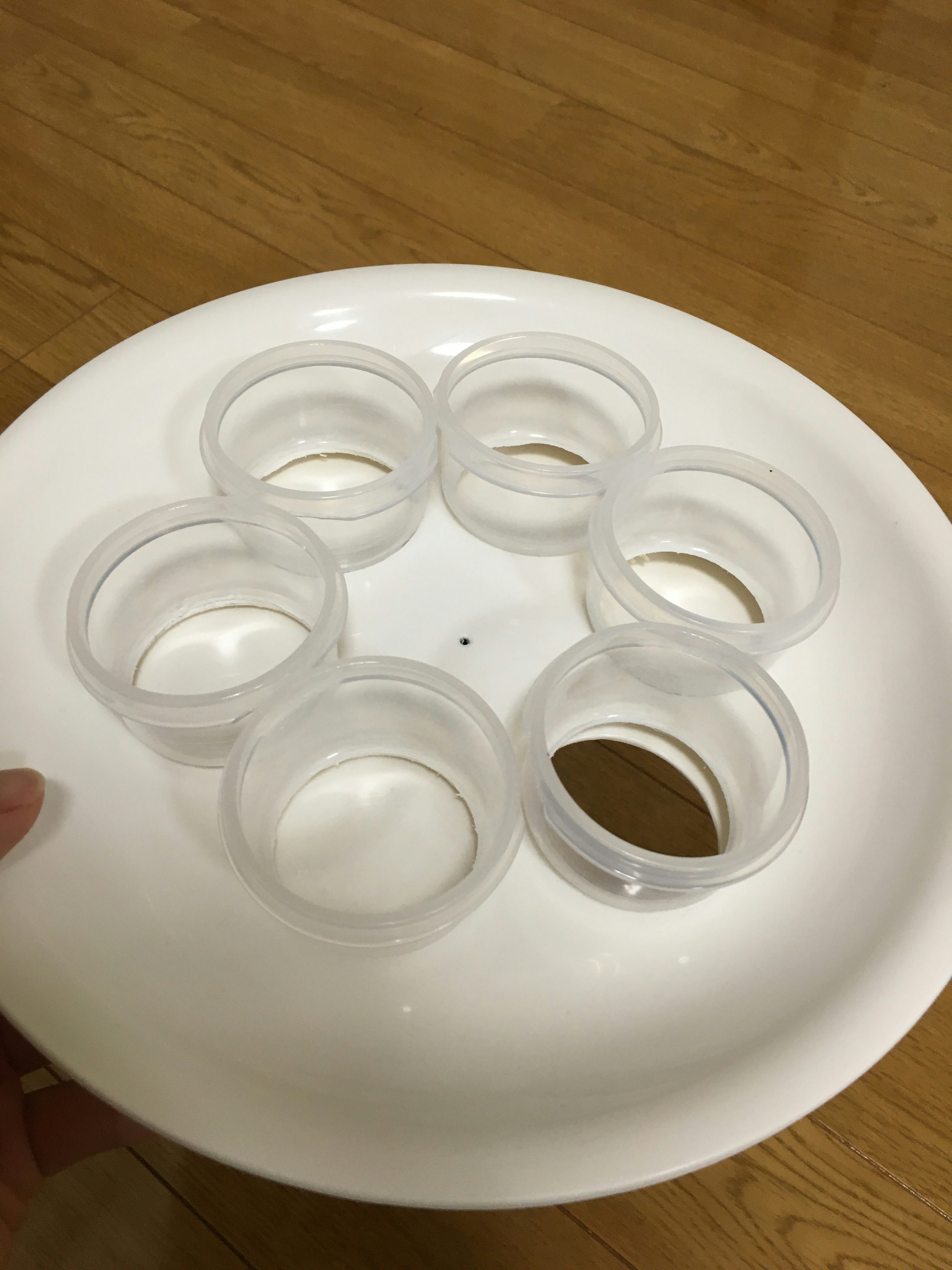 皿及びホルダーとなるプラスチック製の容器の穴は、プラスチック用コンパスカッターで力技でくり抜きます。(皿が硬いと生半可なコンパスカッターでは切れません。今回は1000円程度のコンパスカッターを使用しましたが、1穴開けるのに30分弱かかっていました。)