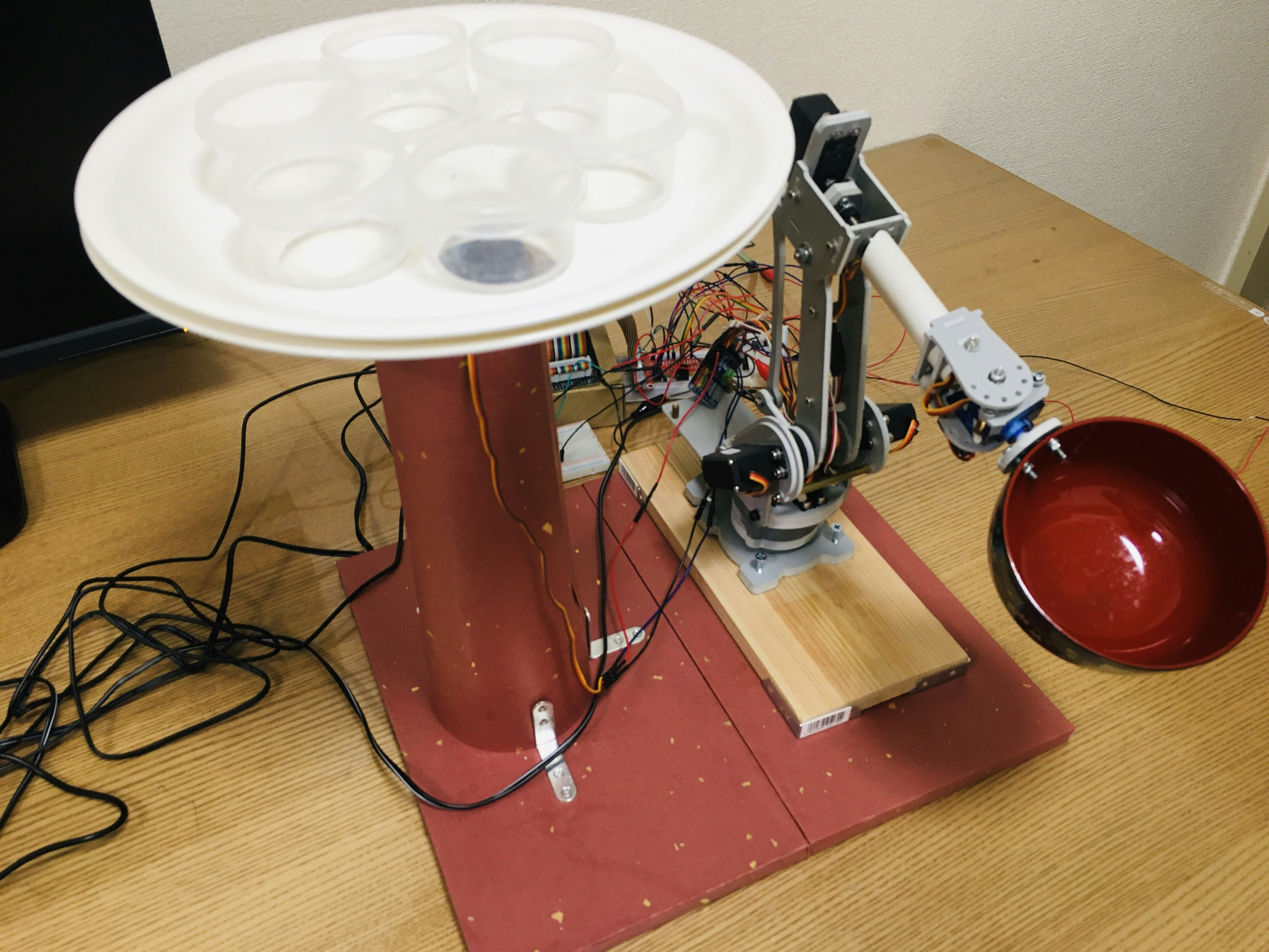 この状態でお代わりを頼む(=感圧センサーにお椀を乗せる)とロボットアームがお代わりを装い、また回転皿が動いてロボットアームにお代わりを補充します。