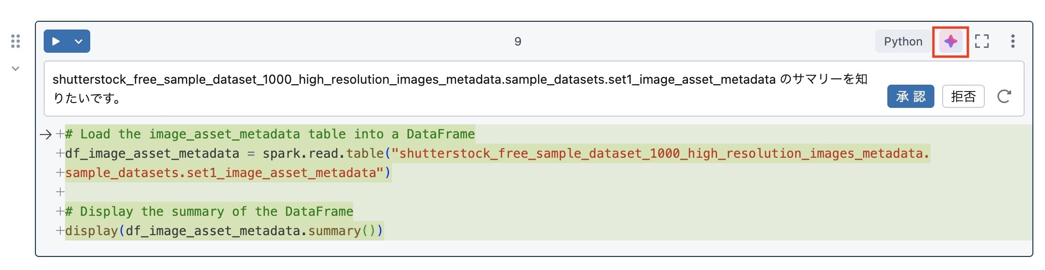 コードのセルを挿入し、以下の文言を入力し、「送信」ボタンを押してみましょう。コードが生成されます。(長いテーブル名はカタログのテーブル名の横にコピーボタンがあります。)