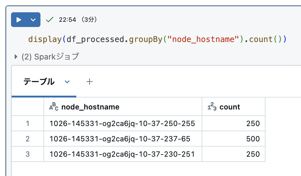 処理ノードのホスト名の集計値もみてみます。先ほどとは違い複数のノードに分散されて処理されていることがわかります。データは必ずしも 1000 ÷ 4 = 250 にぴったり分けられるわけではありませんので、若干偏っています。