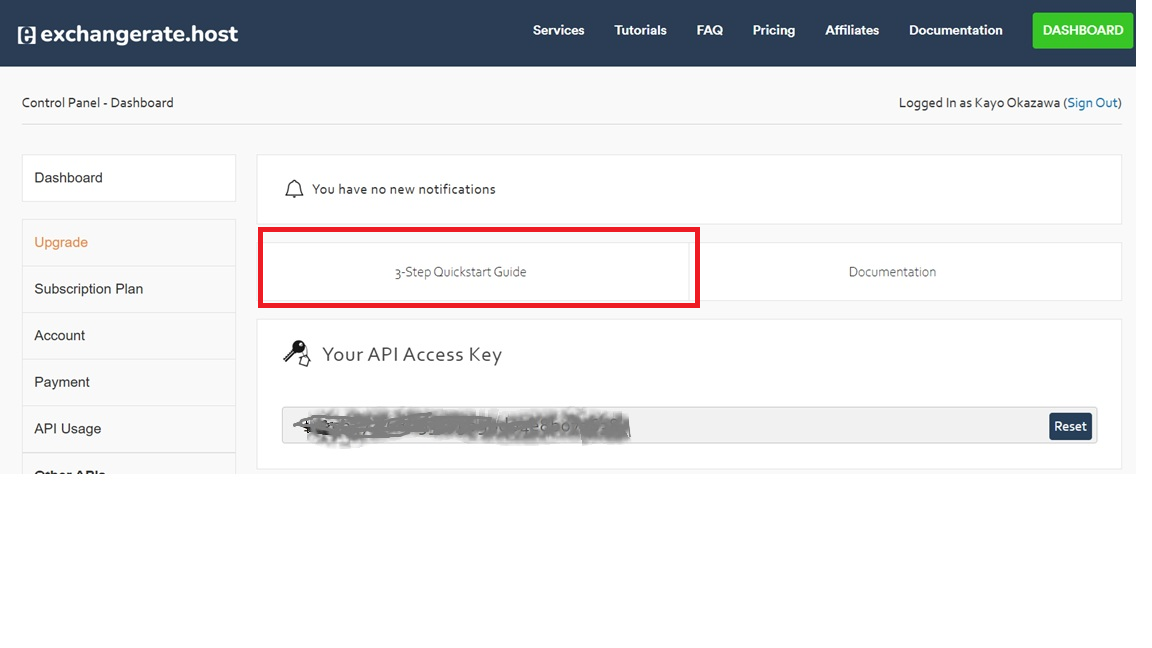 1.exchangerate.hostのサイトにアカウント登録