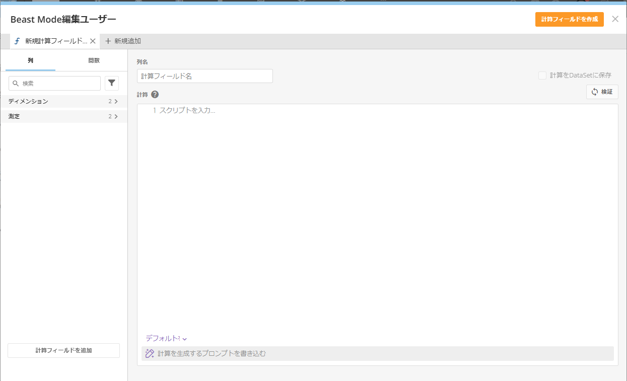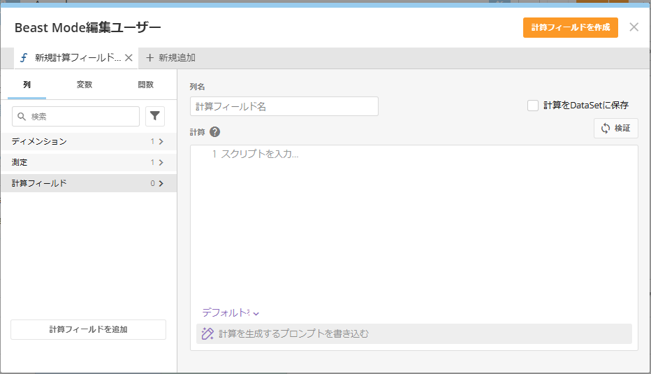 右上の「計算フィールドを作成」よりデータセットを選択したら、記述する計算フィールドが開きます。