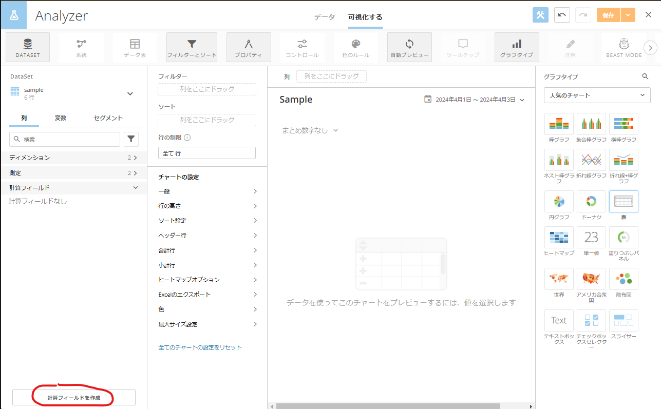 カード編集(Analyzer)画面の左下にある「計算フィールドを作成」で作成できます。